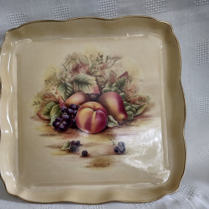 This exquisite gold square tray by Aynsley is a true work of art. Crafted from fine bone china, it features a stunning fruit design that is sure to add a touch of elegance to any room. Measuring approximately 7 inches, it is the perfect size for displaying on a table or shelf.