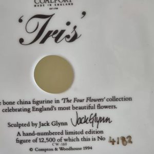 This limited edition figurine from Coalport’s The Four Flowers Collection features a stunning IRIS design, handcrafted from bone china with a glossy finish. Measuring 23cm in height and 17cm in width, it is a perfect addition to any art deco collection.