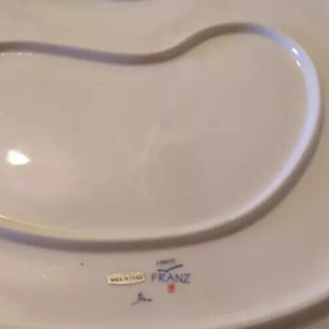 This exquisite Franz porcelain plate is a true masterpiece. The beautiful dragonfly design is hand-painted with intricate detail, making it a perfect addition to any art pottery collection. The plate has a glossy finish and is printed with the Franz backstamp.